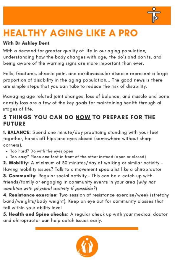 This presentation will cover topics such as balance, co-ordination, bone density, postural change. He will also discuss what Chiropractors can do for you. Link to Zoom (You will need Zoom. Meeting ID: 731 3345 9413 Passcode: 3ZYnFH)